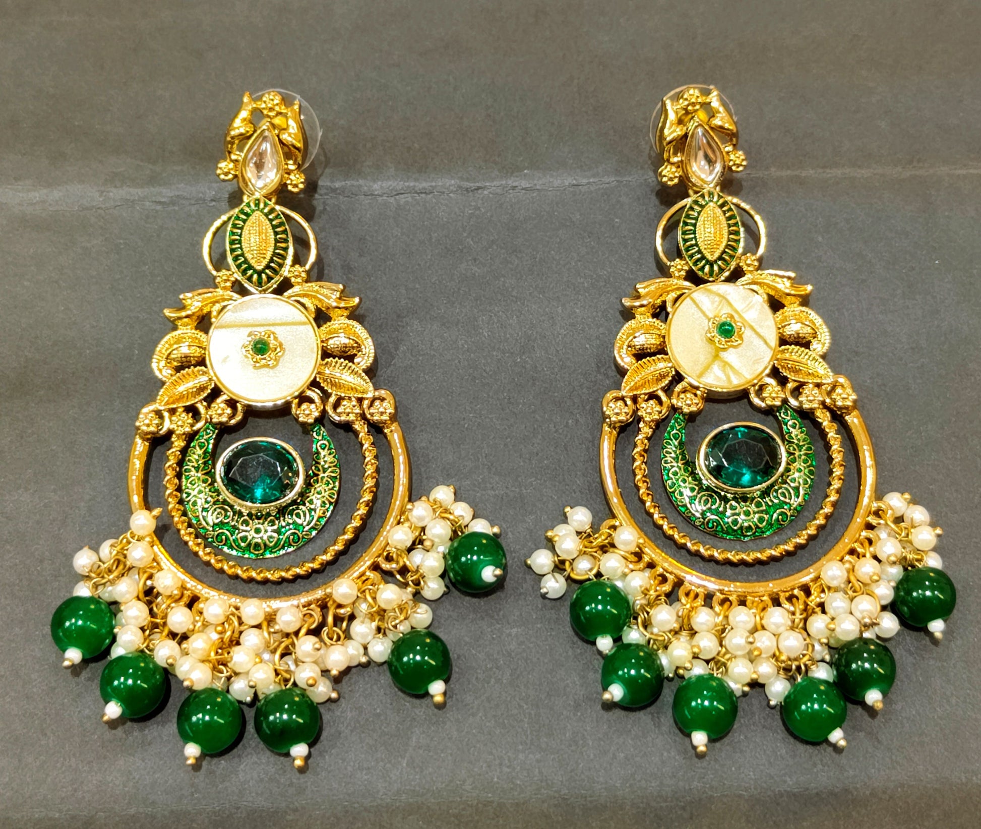 These beautiful EMERLAND GREEN CHITRANGI CHANDBALI Pair with a,silk saree, Lehenga ,gown or Anarkali in gold, ivory , cream and deep wine,mustard,navy blue for a regal vibe and pastel peach and pink for soft and classy look.